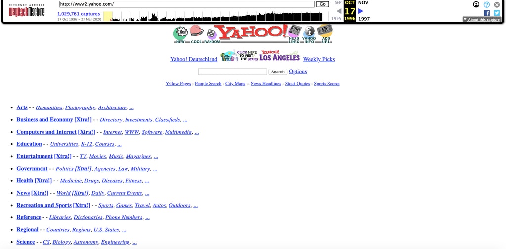 In the early 90s, just as the Internet was being adopted by home users, a site called Jerry’s Guide to the World Wide Web was created. The brainchild of Stanford graduates, Jerry Yang and David Filo, this site would go on to become Yahoo in April 1994. As you can see from the image below, Yahoo was initially a database of websites that was organised through a hierarchical system rather than a searchable index of pages.