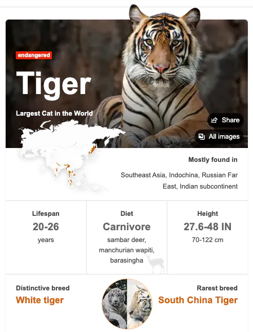 In the example shown here, a search for ‘tiger’ brings up an infographic style search feature. Visually pleasing and immediately engaging, this panel presents key information about tigers in a way that is easy for users to digest. Each fact within the infographic links to a specific source website, so that users can dig deeper if they wish to.