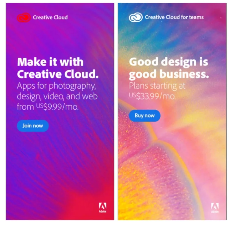 - Creativity and Colour: Adobe’s ads fully embraced the essence of their brand, with their visuals intentionally crafted to catch the eye of design-savvy audiences. Rather than relying heavily on text, the ads let the product’s capabilities speak for themselves through stunning visuals and dynamic colour schemes. This approach not only highlighted what Adobe can do but also mirrored the artistic flair of the audiences they want to reach.