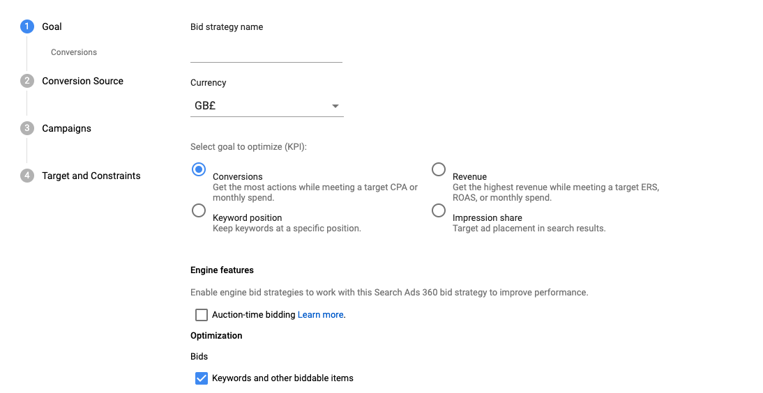 Similar to Google Ads bidding strategies, Search Ads 360 bidding strategies will optimise the performance of keywords and product groups, adjusting bids to achieve the highest number of conversions/amount of revenue/highest impression share/number of clicks, etc.