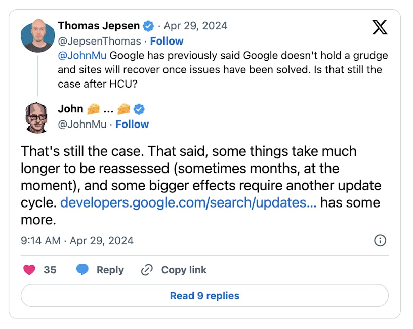 Mueller reiterated Google’s stance that it doesn’t hold grudges against sites and that recovery is possible. However, he acknowledged that reassessment of rankings could take months, and significant effects might require another update cycle.