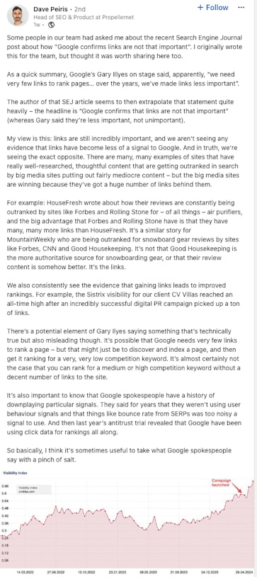 The debate continues over just how much links affect a website’s ranking. On one side, Google is likely to be able to understand web pages without relying so heavily on links. On the other side, relevant links from other reputable websites can still show Google that a site is trustworthy and has expertise in its field (key factors of E-E-A-T). As a rule of thumb, it’s a good idea to try to get links from other sites that are relevant and have a good reputation when you can.