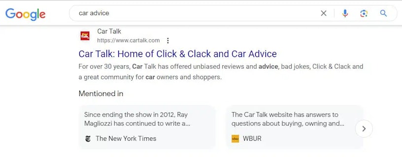 Google has been testing a new feature titled ‘Mentioned in” which appears under the main search result snippet. This new feature is very similar to a previous feature Google had called ‘about this feature’.