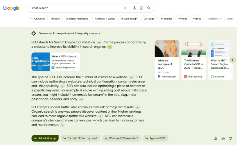 The Google Search Generative Experience is a new experimental Al interface that appears above the search results listings. The responses answer your query by citing websites allowing you to ask additional questions.