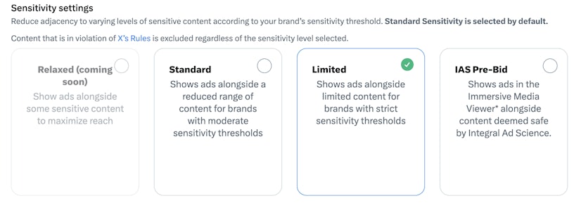 TikTok, Meta and X all provide some control over what kind of content ads can appear against within a user’s feed, on top of a foundation of in-built brand safety measures. Keeping track of these controls and leveraging keyword/topic exclusions to protect brand identity is essential. With brand safety becoming a mounting concern on X, brands looking to leverage the platform should consider reviewing their safety controls (accessible at an ad group level), which offer a range of sensitivity settings as well as keyword and account handle exclusions.