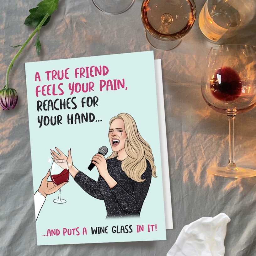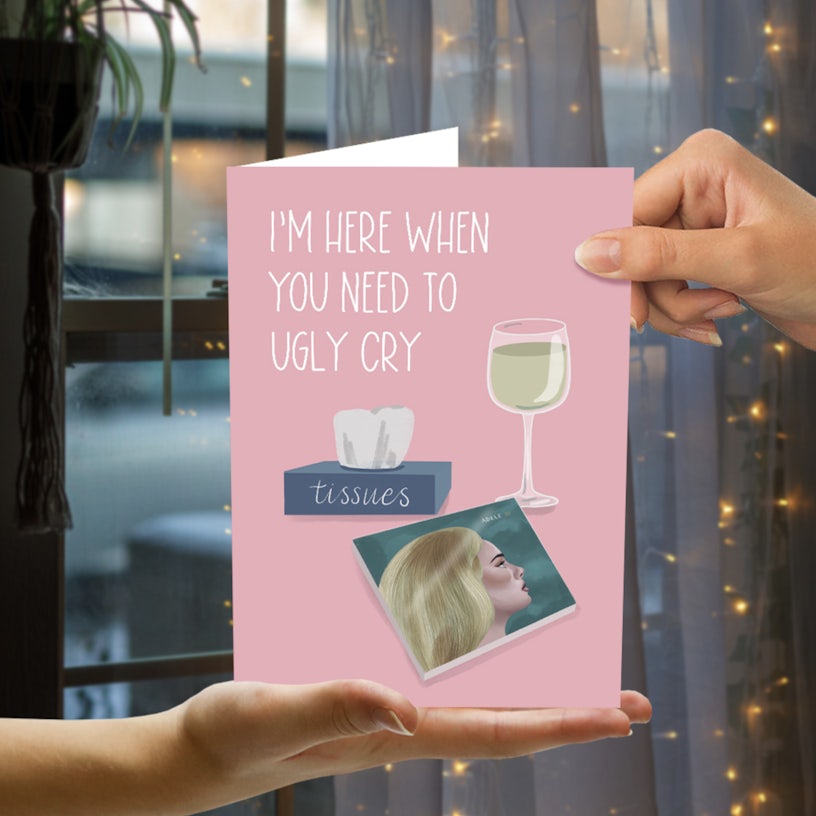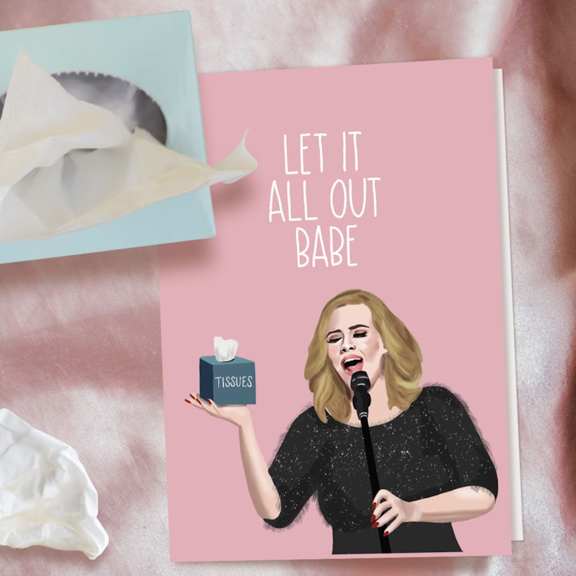 With all of the above in mind, we created a line of Adele-themed ‘emotional support cards’ for the loved ones in your life. The idea being that you could send this Adele-themed emotional support package to your friends and family potentially going through a breakup/divorce or just prepping for an emotional evening of listening.