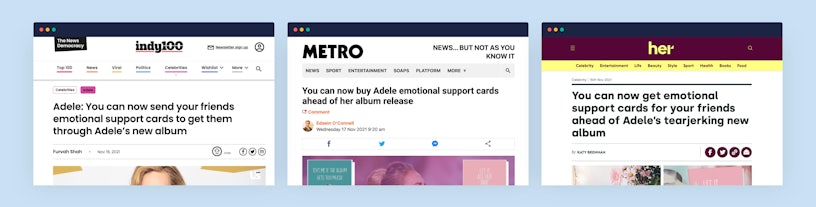 The key to the campaign’s success was having strong designs that would appeal to fans of Adele and her music, which the Funky Pigeon team delivered. Timing was also key, we had a tight deadline to get this activity launched and outreached which added to the excitement of the campaign and its delivery.
