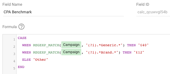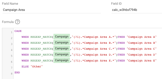 In order to create a custom dimension based on campaign area, you will now need to use a ‘case’ formula to tell Data Studio how to group campaigns based on certain criteria. Using a regular expression match within this will allow you to use your campaign naming customs as the basis for this.