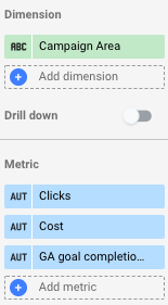 Once you have set up the custom dimension, you will be able to add it to a table which will report on the key metrics for each Campaign Area in a much more concise way than having 5 separate tables. Configuring this in the data tab will look something like the below.