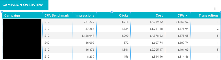 Using Data Studio to report in this way isn’t as simple as it may initially seem. While you can have a table for all of your campaigns, there is no quick way of grouping these by campaign area. Sure, you could use filters to create tables with all of the campaigns within a single area, but this would mean creating 5 separate tables, each with a different filter. This would not be very user-friendly and would take a fair amount of effort to set up.