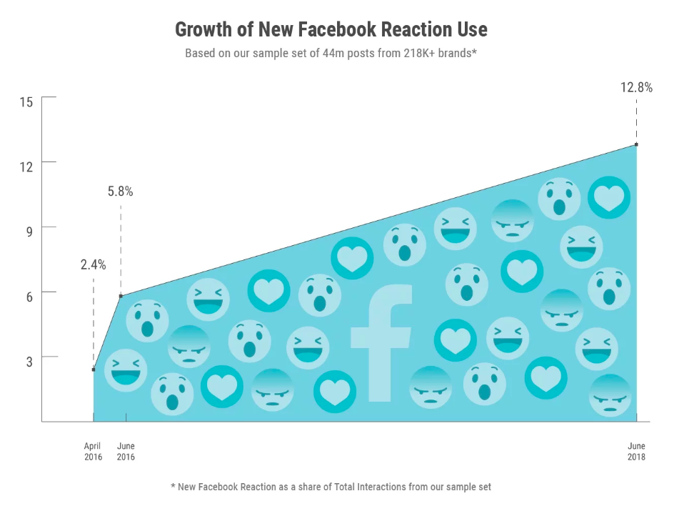 Since the release three years ago, user engagement on Facebook has significantly increased. In a 2018 study by Quintly, it was shown that post engagement with the new reactions was up from 2.4% in 2016 to 12.8% in 2018. This can be seen in the graph below.