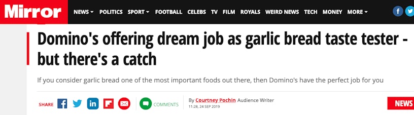 The best place to start with this is to look at your own business and what you want to promote. You might be in a position to craft a dream job around a very broad topic within your business, or, if it’s done before, you’ll need to look much more niche – think ‘garlic bread taster’ rather than ‘restaurant reviewer’.