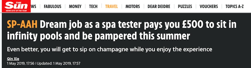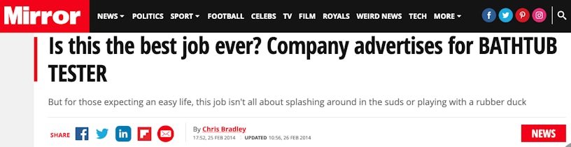Back in 2014, Lexi Mills (very awesome digital PR, I recommend following her for more tips) created the Bath Tester role to promote Bathstore. It was cool because it seemed very unlikely someone would actually pay for that service, so had that element of surprise to it, and also sounded like a lot of fun – imagine sitting around in bathtubs all day!