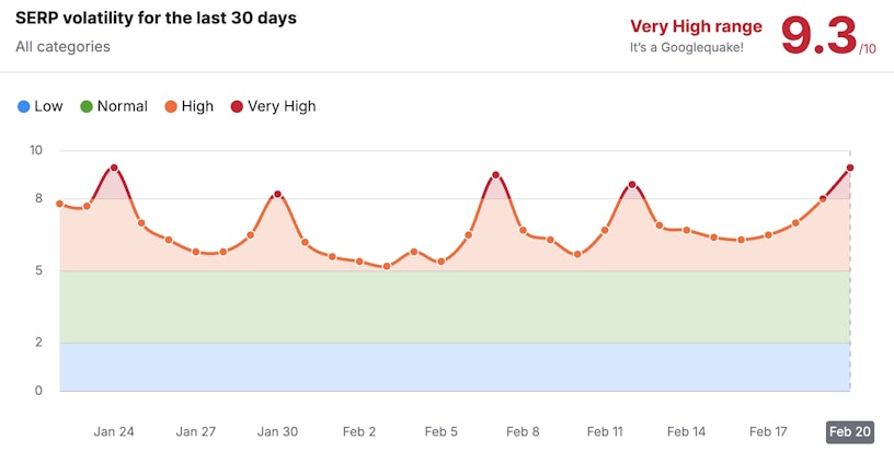 At the tail end of January and throughout February, search ranking volatility was reported on several occasions. Third-party tracking tools noted very high levels of SERP volatility around the 24th and 30th of January. Similar levels of volatility were also observed throughout February on the 7th, 12th, 20th, 26th and 27th.