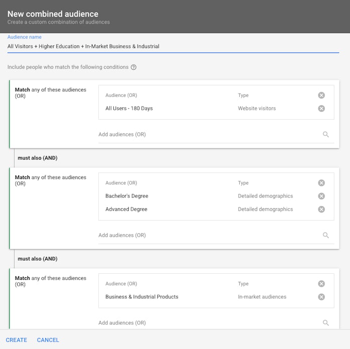 This will open a pop-up which will allow you to build a combined audience, which you can see an example of below. Here I’ve created an audience which targets any previous website visitors from the last 180 days, who have also got a Bachelor’s or higher degree and are in-market for business & industrial products. As the link between each condition is AND rather than OR, users who fall into this audience must fit all conditions rather than just fitting any single one. It’s also possible to exclude audience segments from your Combined Audience in this window.