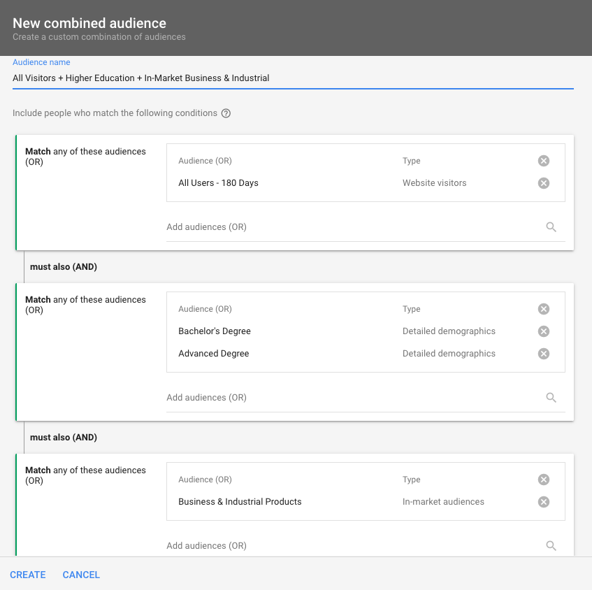 This will open a pop-up which will allow you to build a combined audience, which you can see an example of below. Here I’ve created an audience which targets any previous website visitors from the last 180 days, who have also got a Bachelor’s or higher degree and are in-market for business & industrial products. As the link between each condition is AND rather than OR, users who fall into this audience must fit all conditions rather than just fitting any single one. It’s also possible to exclude audience segments from your Combined Audience in this window.