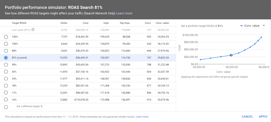 According to Google “The Target ROAS simulator shows the relationship between a ROAS target and your key metrics. For example, let’s say you’re interested in seeing how a higher target would impact your performance. Using data from the auctions you participated in over the last 7 days, this tool will show you what would have happened assuming everything else (e.g., your ads, landing pages, competitor ads, competitor bids etc.) stayed the same”.
