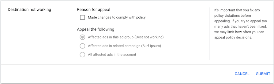 As you can see in the screenshot, Google now gives you the option to appeal the ad disapproval in the UI. If you’re eligible for the “appeal” link, all you will have to do is hover over the disapproved/limited ad and the pop up should show. After clicking on the appeal button, you will be greeted with the following options, which will allow you to submit your reason for appeal.
