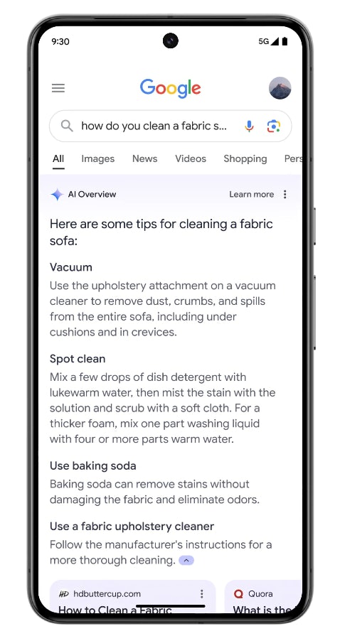In this screenshotted example provided by Google, the user’s query is ‘how do you clean a fabric sofa’. By amalgamating information sourced from articles and forums online, Gemini is capable of composing a summary that outlines some tips for achieving this task, followed by tiles beneath that provide links to the sources of this information.