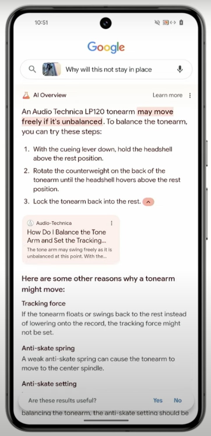 From this, Gemini is capable of assembling a short but useful summary of tips that could help, linking to a relevant how-to article on the topic, and suggesting some other possible issues that could cause a tonearm to move as shown in the user’s video.