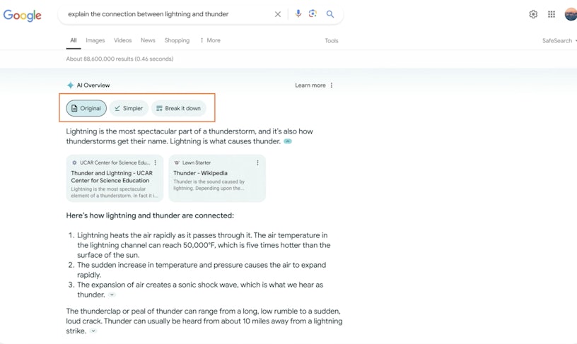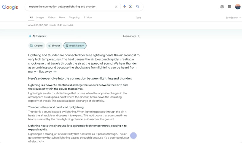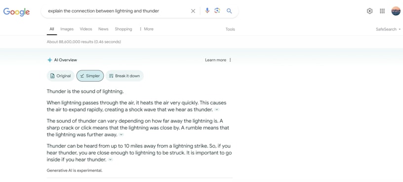 In the example highlighted by the screenshot below, we can opt to view a simpler Overview. Here the user has submitted the query ‘explain the connection between lightning and thunder’, then requested a simpler summary of the response: