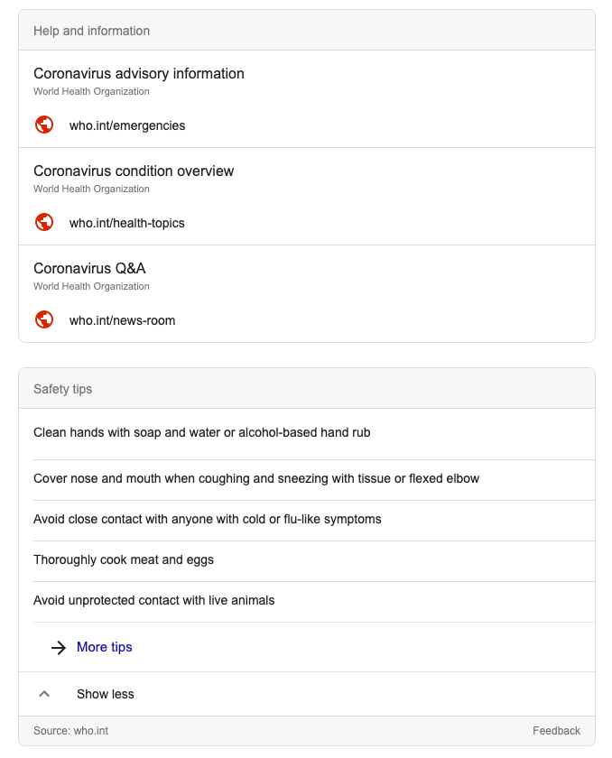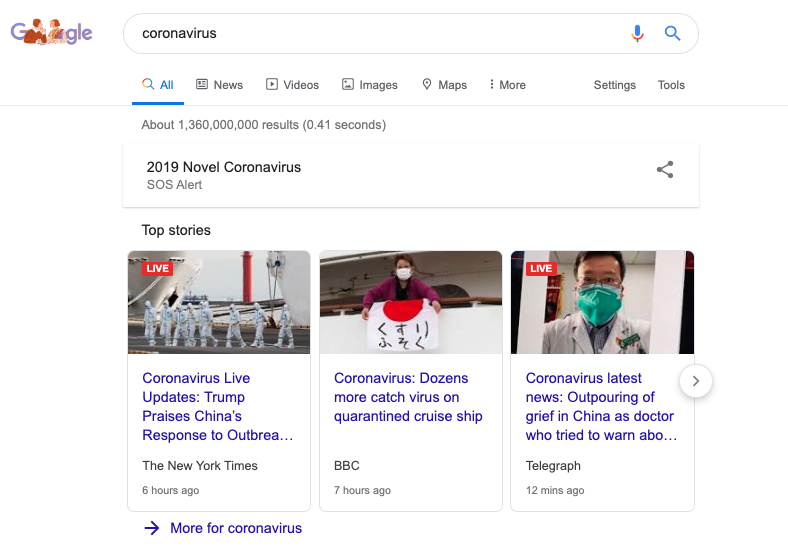 In response to the Coronavirus virus outbreak from Wuhan in China, first reported on the 31st December 2019, Google is activated an SOS alert in the search results in partnership with the World Health Organisation.