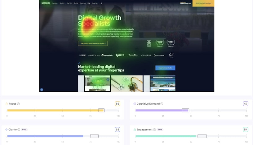 - Clarity – how clear your website is to users. Websites with a low clarity score will appear cluttered and hard to navigate and interpret.