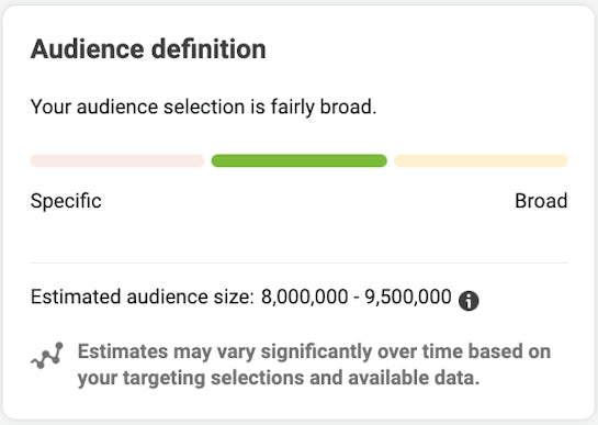 Meta’s audience definition feature will provide an estimate of how big your audience is based on the targeting options chosen. As we touched on earlier, the idea is to create a fairly broad audience – targeting users who are likely to have an interest in your brand without being too specific – as this can result in narrow audiences which can increase costs.