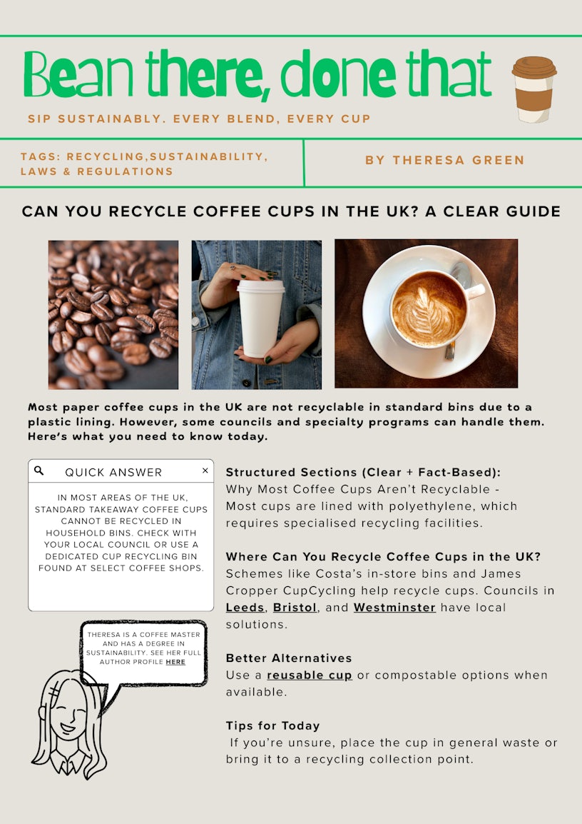 - Conversational H1: Can You Recycle Coffee Cups in the UK? A Clear Guide