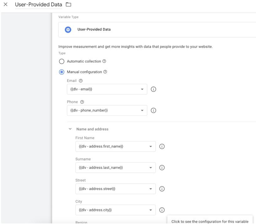 The easiest way to set up consent mode is through Google Tag Manager. Specifically for this purpose, there is a new built-in variable called ‘User-provided data’. This variable can be set to automatically attempt to collect the appropriate data by analysing each page and trying to detect values which match email addresses, telephone numbers etc. Whilst this can work, we always recommend manually specifying each variable as this will result in more accurate results.