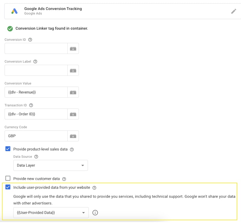 Once you have your new variable set up, the next step is to configure your tags. For this example we’ll be setting up Enhanced Conversions for a Google Ads conversion tag, specifically a purchase event. In setting this up you’d enter the appropriate ID and Label provided in Google Ads and add a revenue and Transaction ID variable in the appropriate fields. To then enable Enhanced Conversions, you tick ‘Include user-provided data from your website’ and select the new variable you’ve set up.