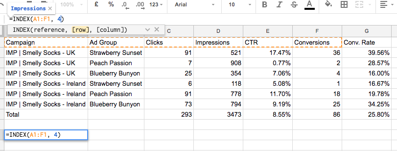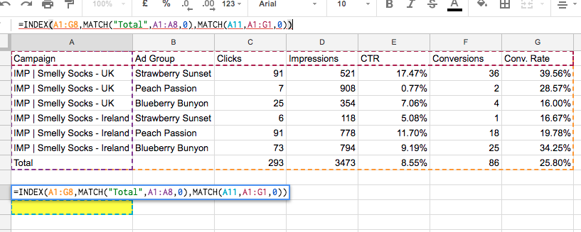 Rather than attempting to search for a value which may or may not be in the range you’ve specified, INDEX MATCH allows you to turn the whole range into a grid and select exactly the cell that you’re looking for – every time. Technically speaking, INDEX MATCH isn’t a spreadsheet function, it’s two: INDEX and MATCH. Let me break them both down before explaining why they’re so much more powerful together and how to use them for PPC.