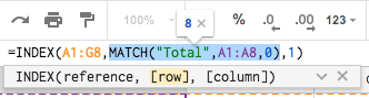 This gives the value of the cell in the top lefthand corner of the table – A1 in this case. Now it’s time to replace each of those 1’s with a MATCH function. Since the first 1 corresponds to the row, I’ll use this one to create a MATCH function that selects the row containing the total.