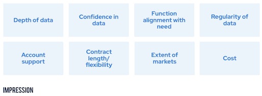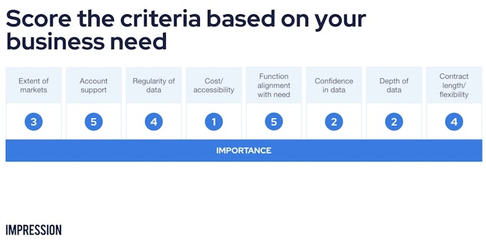 These are only a few examples but provide a good starting point. Out of these criteria, you then need to assign a score based on importance. Think about what factors will matter to you the most. Is it the cost or accessibility? The number of markets, or the amount of support you will get from the account team?