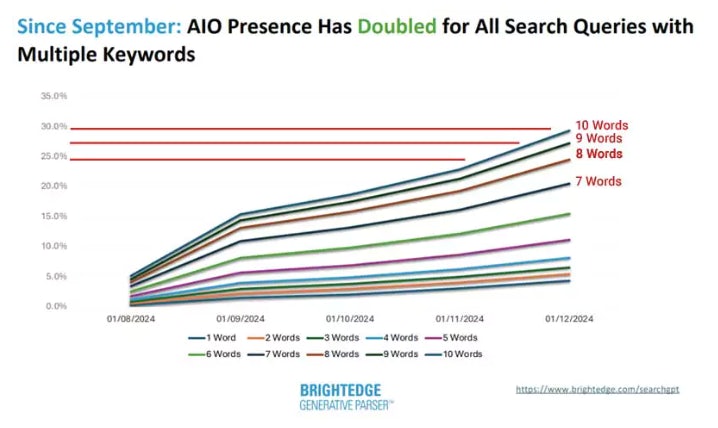 The integration of AIOs has led to notable changes in SERP layouts and it continues to evolve. Recent research from BrightEdge indicates that AI Overviews are now appearing in 25% of searches containing eight or more words, which is now at an all-time high. This trend suggests that Google is refining AIO’s accuracy, making it more effective at handling complex queries. While shorter keyword phrases continue to trigger AIO, the most significant growth is seen in longer, more precise search terms.