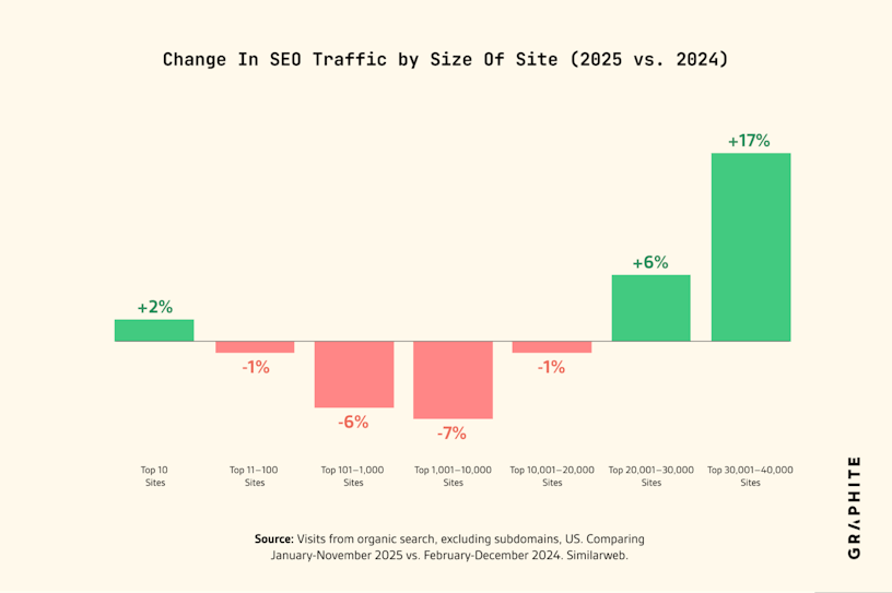 Contrary to sensational claims (e.g., -25 % or more), the data shows that organic search has remained relatively stable amid the rise of AI Overviews, with overall search engine traffic even increasing slightly (+0.4 %) and Google traffic rising about +0.8 %. Large sites (top 10) saw traffic increase by around 1.6%, while mid-range sites (ranked ~100–10,000) experienced the largest declines. This is a nuance often lost in broad narratives.