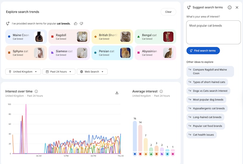 Google has woven Gemini 3, its latest large language model, directly into the search experience. When users ask follow-up questions in AI overviews, they are sent instantly into AI mode, instead of staying in the static overview page as before. Furthermore, Google has introduced AI-powered features to Google Trends, allowing users to dive deeper into search trend data using AI insights.