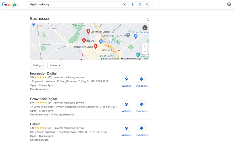 However, if we scroll down a little further, Google also returns a local pack which shows local businesses that offer digital marketing services. This result has commercial intent.