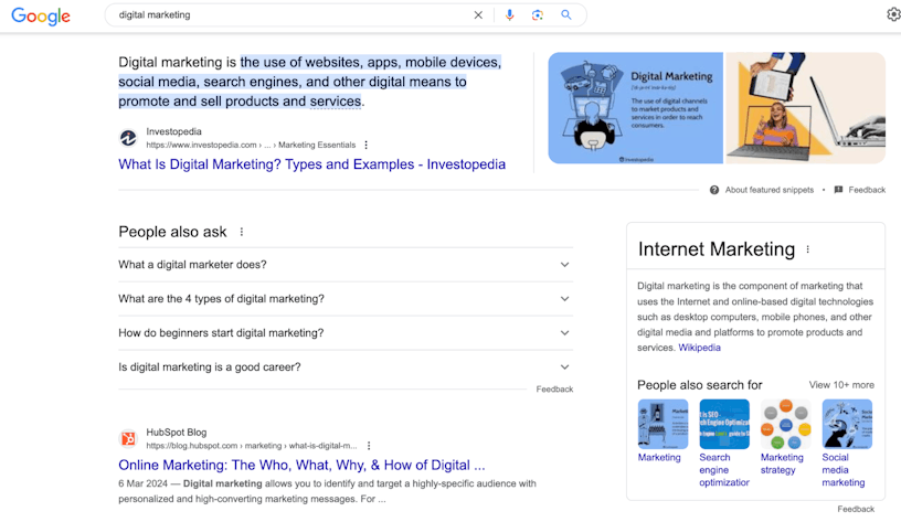 As we can see from the screenshots below, some users may be looking for more information on digital marketing such as what it is, what it involves and how to do it. These search results have informational intent.