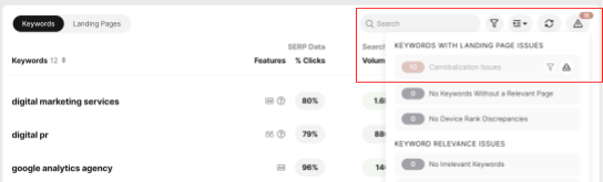 Keyword tracking tools such as SEOmonitor will allow you to see what pages are ranking for specific keywords. You can then monitor fluctuations whereby different pages are ranking for the same keyword. Once you’ve noted these down, you’ve found your problem pages. These tools also have specific keyword cannibalisation filters which automatically pull out potential issues with your tracked keywords.