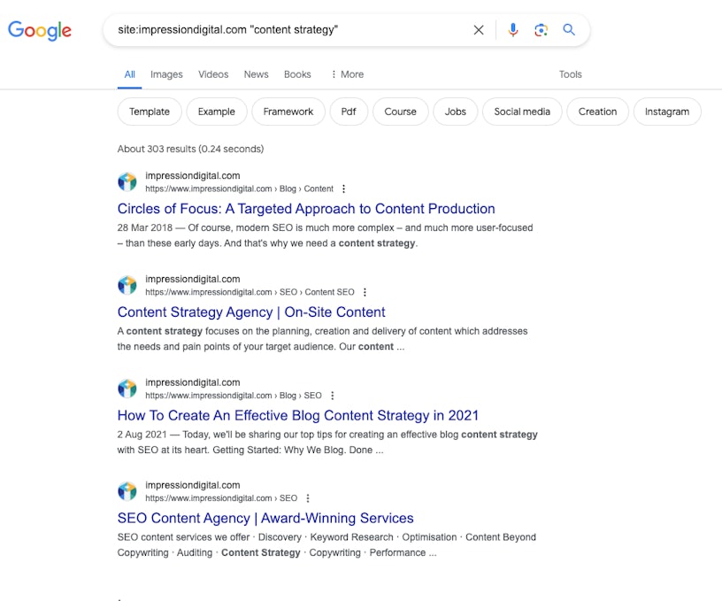 Another method you can use is the site: search operator. For example, if we wanted to find pages on our website which mention the keyword “content strategy”, we would search using site:impressiondigital.com “content strategy”.