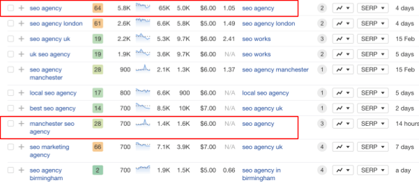 For example, the search term “SEO agency” has a CPC of $6.00 but a keyword difficulty of 64. Whilst this is a commercially valuable term, it is incredibly competitive meaning it will be hard to rank for. Instead, targeting a term such as “SEO agency manchester” which also has a CPC of $6.00 and keyword difficulty of 28 would be more achievable.