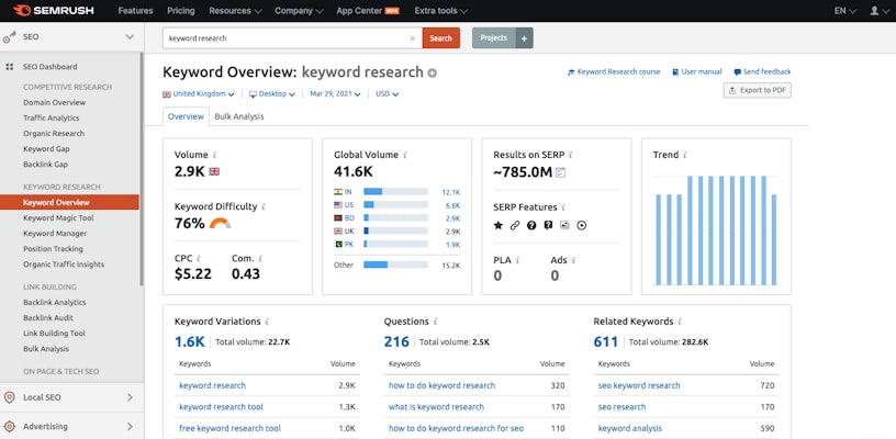 The output of keyword research is a list of relevant target keywords and data – from average monthly search volumes to keyword difficulties and current rankings. You can then target these terms by using them in the content you create, which will hopefully rank in the search engine results pages (SERPs), capture SERP features and attract users to click through to the site.