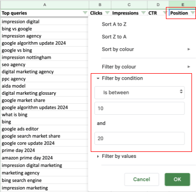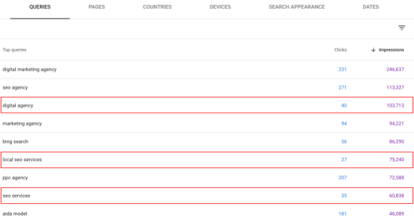 This keyword research tip is useful for optimising your existing content to maximise organic traffic. Open up Google Search Console and view the Performance report for a particular page, then sort the queries by impressions from high to low as shown below: