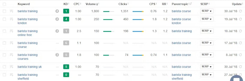 Taking the example of ‘barista training’, we have put this into Ahrefs. As you can see from the screenshot below, it suggests a list of keywords that use similar terms, along with search volume, keyword difficulty and even an estimated number of clicks through to pages on the SERPs.