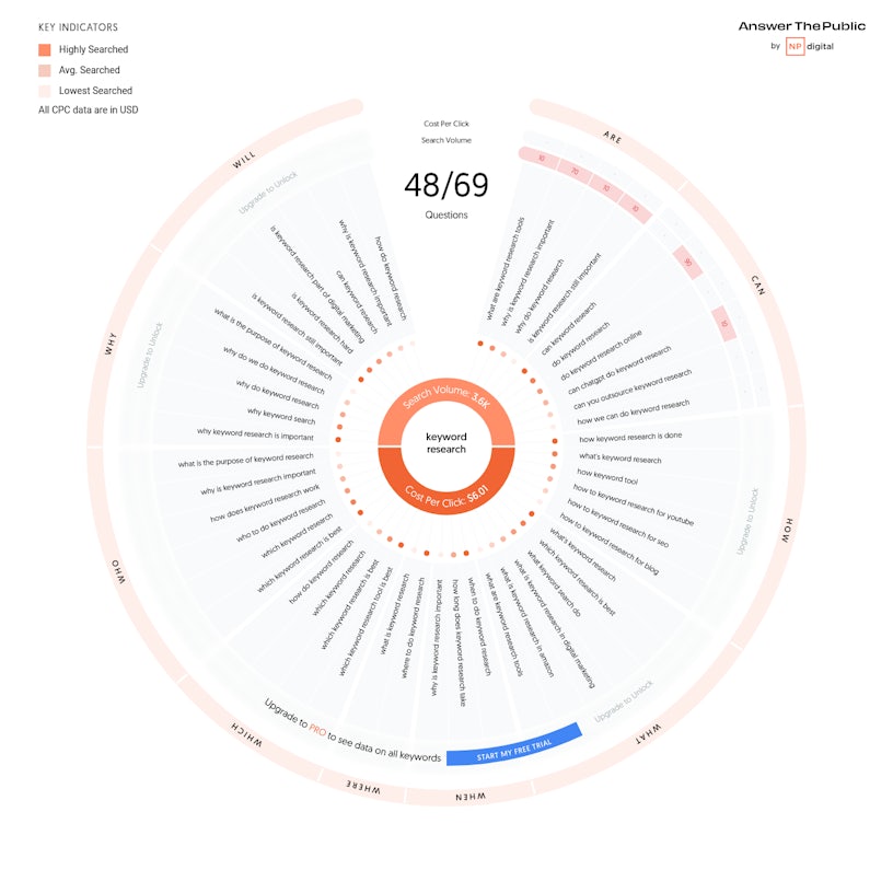 AnswerThePublic.com reverse-engineered this function and created a platform that suggests variations of whatever search query you put in, dividing the queries into question categories ranging between ‘what’, ‘why’, ‘how’ and more. Not only is the end product visually engaging, but it also provides a huge insight into variations of keywords that other tools may not have picked up on.