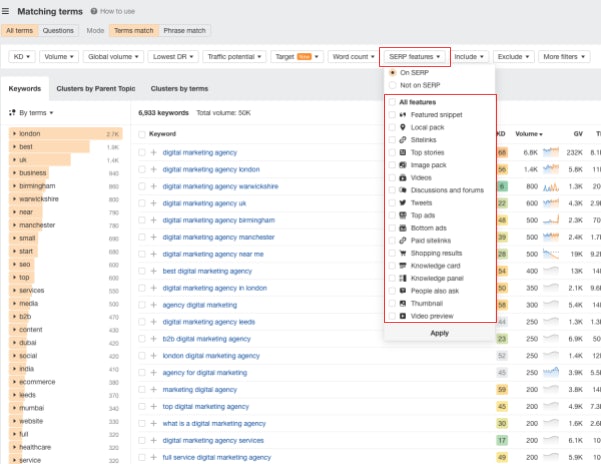 Looking for opportunities where your competitors rank for SERP features and you don’t is a good approach. Keyword research tools like the ones mentioned above have features which allow you to filter and organise keywords based on search volume, keyword difficulty and SERP features. This can help you to rule out any search terms which may be unachievable whilst highlighting feasible opportunities.