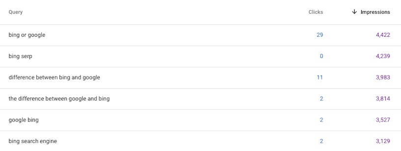 Here, we’re looking for keywords with high numbers of impressions but relatively few clicks. In the example above, ‘bing serp’ fits this description perfectly.