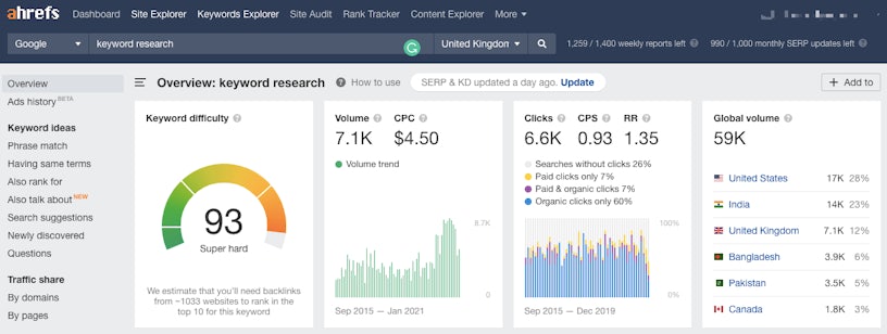 Certain keywords have lots of established, authoritative sites ranking for them, making it a real challenge to gain a position on page one. For example, ‘keyword research tips’ fits into this category with an Ahrefs Keyword Difficulty of 73, so achieving a top ranking for this term is no mean feat!