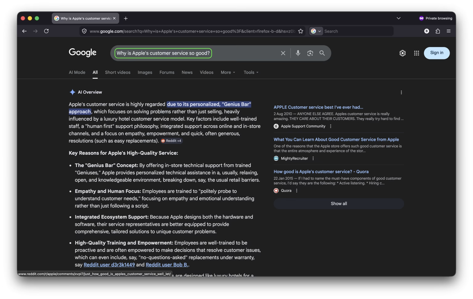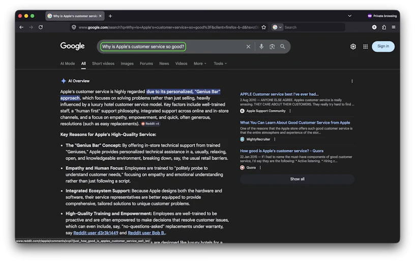 This creates a potential tension: while the model is meant to provide accurate, reality-based responses, the “supportive collaborator” approach may override neutrality, leading the AI to reinforce the user’s framing. For example, negatively framed queries may elicit more negative answers, whereas positive queries may amplify favourable viewpoints. Rather than balancing perspectives, as traditional search results do, AI responses may reflect and reinforce existing sentiment.